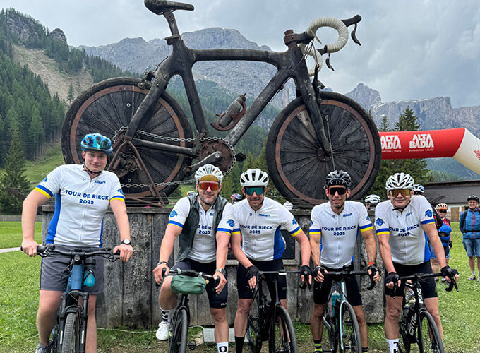 Ab in die Dolomiten: So lautete der Aufruf in unserer Mitarbeitenden-App. Wer möchte an der `Tour de Rieck 2025´ von München zur Sella Ronda in Italien teilnehmen? Perfekt organisiert mit ausgetüftelter Route, Hotelübernachtungen, Service-Begleitfahrzeug, einem Starterpaket sowie Rieck-Fahrradtrikots. Einzige Voraussetzung: mindestens 1.500 Trainingskilometer im Sattel. Einige waren interessiert, fünf Radsportbegeisterte fanden sich schließlich für die Tour zusammen.